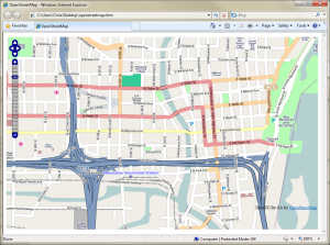 The screenshot on the left is showing an example of embedding OpenStreetMap imagery within a web page using OpenLayers. OpenLayers is an open-source, JavaScript-based Map control similar to the Bing Maps for Enterprise JavaScript Control and the Google Maps API; except it’s free to use and offers some decent mapping when combined with OpenStreetMap.